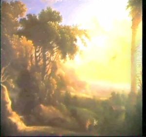 An Arcadian Landscape With Maidens Resting Before A Temple Ruin