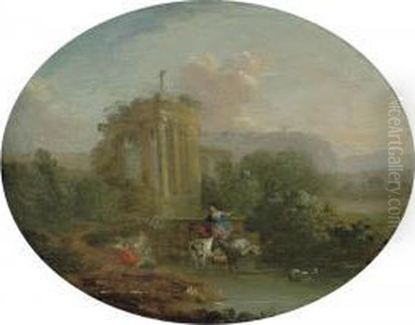 An Italianate Landscape With Drovers And Their Herd Watering Beside Classical Ruins