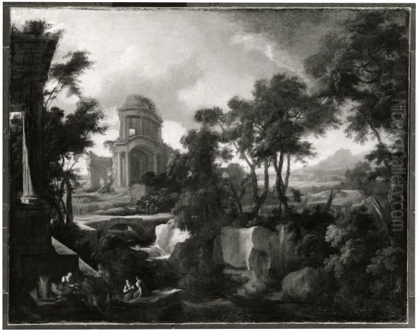 Klassiskt landskap med ruiner och skordearbetare