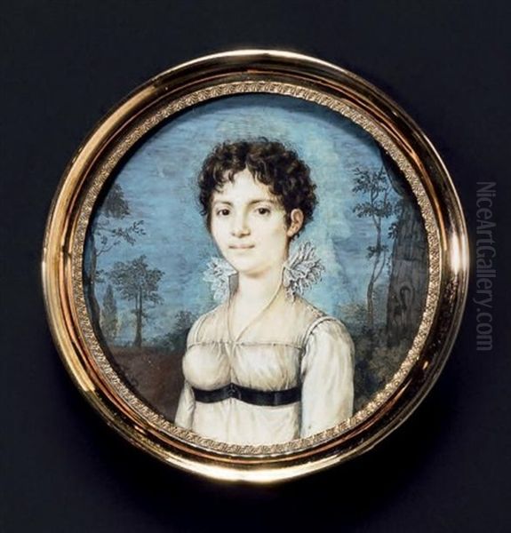 Portrait De Mademoiselle Delpire, En Buste, Presque De Face, En Robe De Voile Blanc, Taille Haute A Ceinture Noire, Et Col De Dentelle A L'anglaise Elle Est Coiffee De Fines Boucles Et Vue Dans Un Fond De Paysage