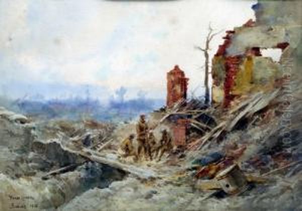 Somme 1916, Four British Soldiers Take Rest Within Brick Ruins
