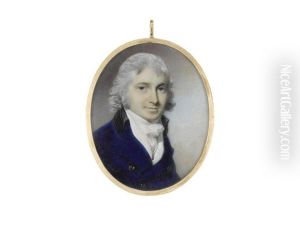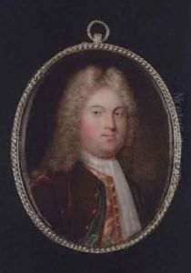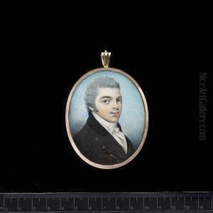 A Pair Of Portraits Of A Lady And Gentleman: She, Wearing Crimson Dress With White Gauze Sleeves, Her Auburn Hair In Ringlets; He, Wearing Dark Green Coat With Black Collar, Yellow Waistcoat And White Cravat Held With Stickpin