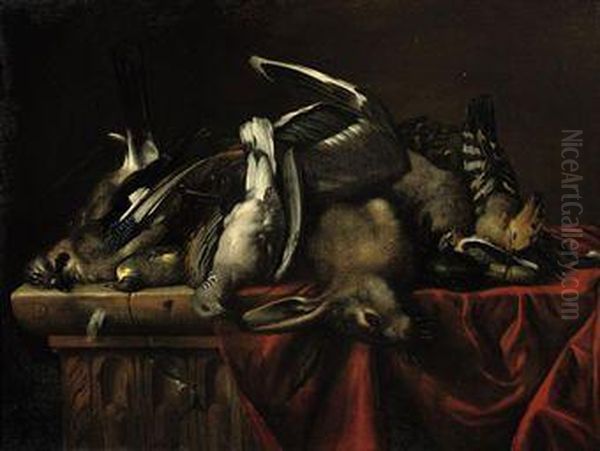 A Hare, A Jay, A Partridge, A Duck And Other Birds, All On A Drapedmarble Ledge