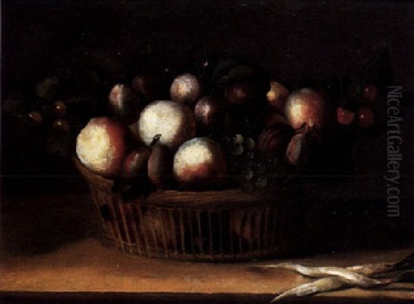 A Still Life Of Peaches, Plums, Grapes,and Other Fruit In A Wicker Basket, With French Radishes, All Upon A Stone Ledge