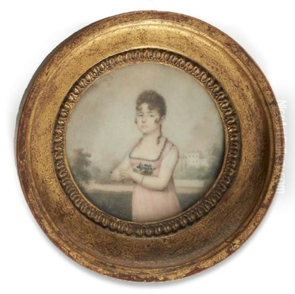 Portrait D'une Jeune Fille En Robe Rose Tenant Un Bouquet De Pensees, Devant Un Paysage Campagnard