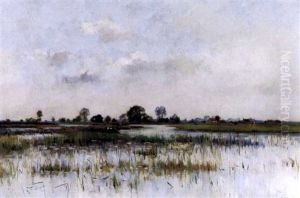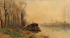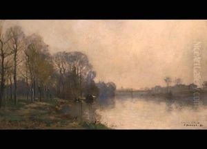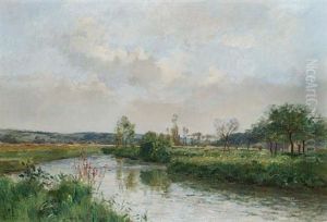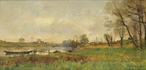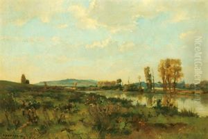 Franzosische Fluslandschaft. Im Hintergrund Eine Eisenbahnbrucke