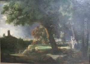 Italianate Wooded Landscape With Two Fishermen By A Stream