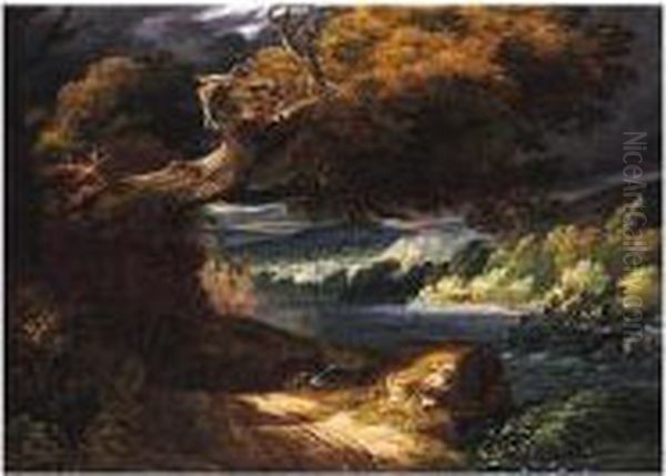 A Stormy Landscape With A Fallen Oak Beside A River, A Town Beyond
