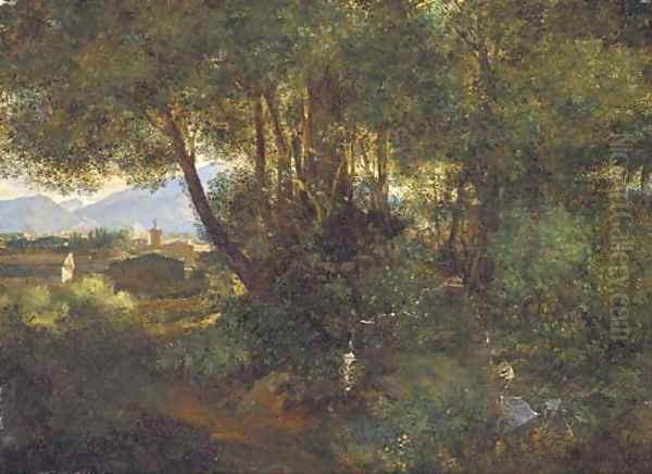A woodland path before an Italianate town