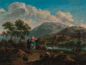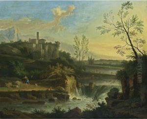 A classical river landscape with figures on a path, a town beyond