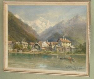 Kleine Ortschaft An Einem Fluss Gelegen, Im Vordergrund Weidende Kuhe