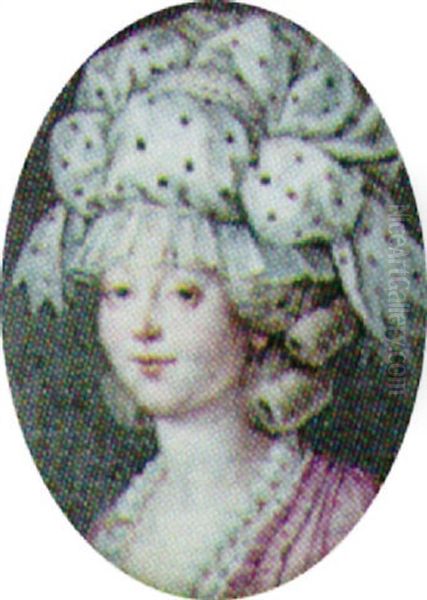 A Lady In A Lace-trimmed Pink Dress With An Elaborate Plum-spotted White Cap