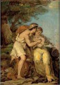 A Couple Embracing, With Cupid Tugging At The Woman's Skirts