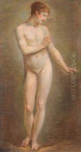 Academic Study Of A Male Nude Standingfull-length Holding An Oar
