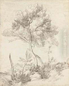 Two Umbrella Pines In A Hilly Landscape