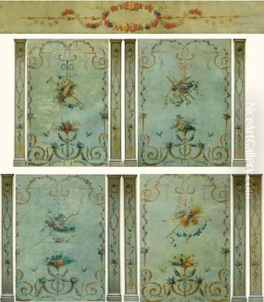 Ensemble De Seize Panneaux Decoratifs A Motifs De Guirlandes De Fleurs, De Fruits Et D'instruments Aratoires Comprenant :