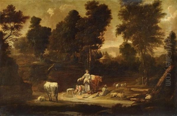 Hirten Mit Ihrem Vieh In Bewaldeter Campagnalandschaft