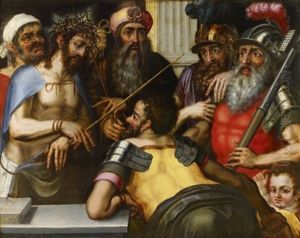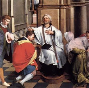 A Cathederal Interior With A Priest In The Act Of Absolution