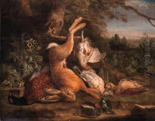 A Dead Hare Hanging From A Tree With A Dead Pheasant, A Snipe, Adove, A Patridge And Dead Songbirds On A Mossy Bank In Alandscape
