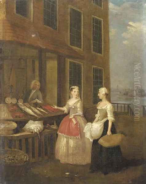 A lady and her maid at a fishmonger the river Thames with the Monument and the City of London visible beyond