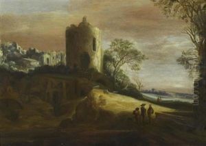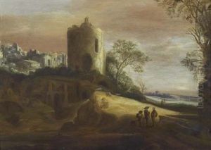 Gebirgslandschaft Mit Einem Rundturm Und Reisenden