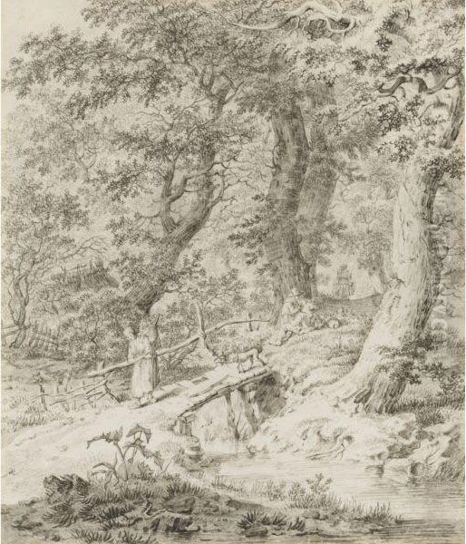 Wooded Landscape With Peasants, And A Dog On A Bridge