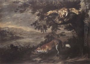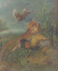 A Fox Chasing A Cockerell By A Thistle In A Landscape
