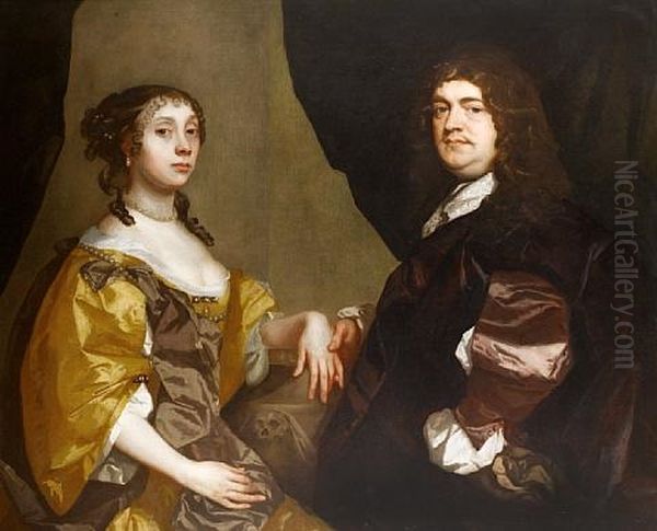 Portrait Of A Gentleman And His Wife He Wearing A Brown Tunic And Cloak And She Wearing A Yellow Satin Dress