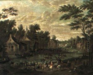 A Townscape With Many Figures In A Market Place Beside A Canal, A River Beyond