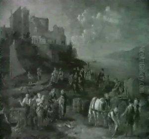 A Hawking Party Stopped By A Fountain A Mountainous Landscapes Beyond