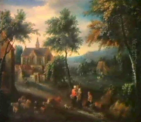 Waldlandschaft Mit Bauern Und Einer Herde Vor Einem Dorf