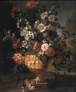 Tulips, Daffodills, Carnations And Other Flowers In A Sculpted Urn On A Ledge