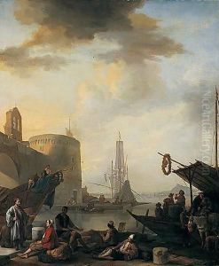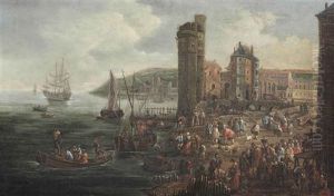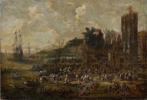 An Extensive Harbour Scene With Figures Gathering On The Shore