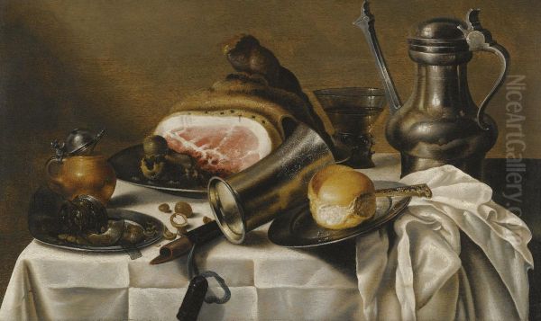 A Still Life Of Ham, A Pewter Plate, A Pewter Pitcher, A Glass Roemer, Hazelnuts, A Bread Roll And Other Objects On A White Table Cloth