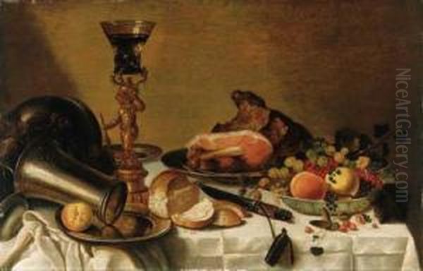 Fruit In A Wanli Kraak Porselein Bowl, A Ham On A Pewter Plate, Aroemer On A Silver Gilt Mount In The Form Of Bacchus, A Pewterbeaker On A Pewter Plate, A Bread Roll And A Knife On A Drapedtable
