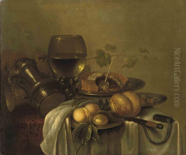 Peaches On A Silver Platter, An Overturned Pewter Jug, A Roemerwith White Wine, A Bread Roll, Olives And A Pie On A Silverplatter, Together With Other Objects On A Partially Drapedtable