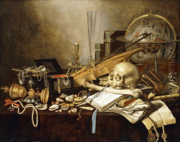Still life with skull, globe, shells, jewelry box and other objects