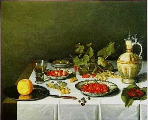 Stilleven met bessen, bramen en ander fruit in porseleinen schaaltjes, glazen en schenkkan op wit servet