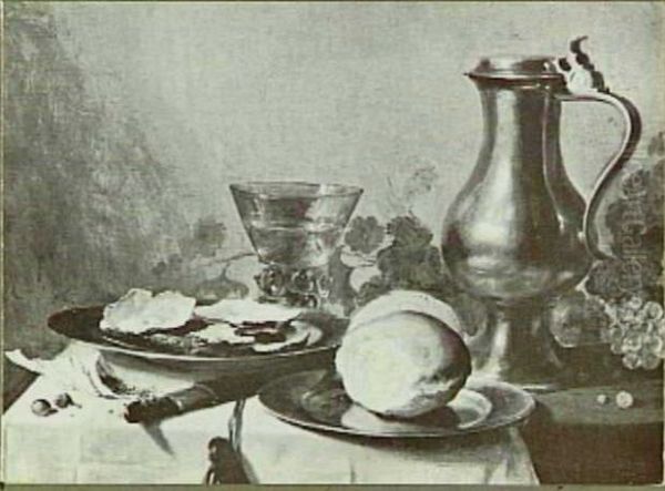 Stilleven met kan, roemer, bord met oesters en broodje