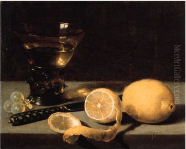 Stilleven met roemer, mes, citroenen en enkele druiven