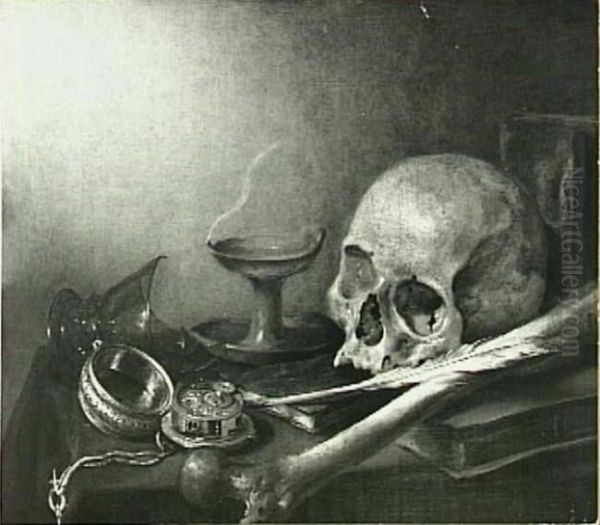 Vanitasstilleven met schedel, gebroken glas en horloge