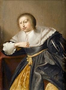 An Interior With An Elegantly Dressed Lady Seated At A Table