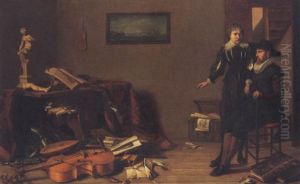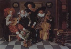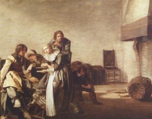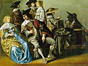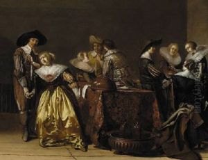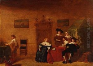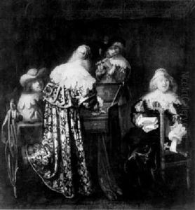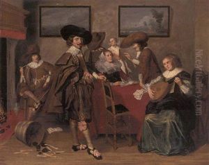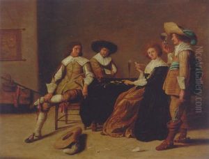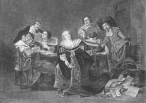 An Interior With Militiamen Playing Tric-trac Watched By Two Elegant Women