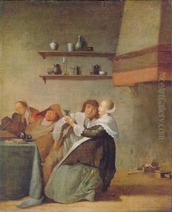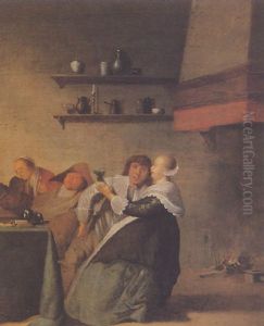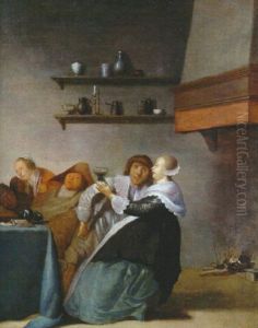 A Tavern Interior With Figures Drinking And Sleeping Around A Table Beside A Fireplace