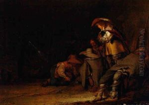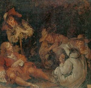 A Tavern Interor With Figures Drinking And Sleeping Around A Table Beside A Fireplace
