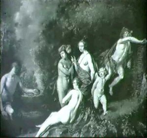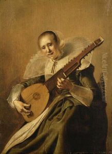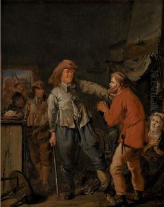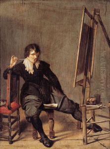 An Artist in his Studio, seated on a Stool, in front of an Easel, with a Pipe Raised to His Mouth