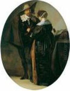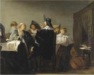 Codde's genre scenes often depict elegant figures in interior settings, engaging in music-making, dancing, or enjoying conversation. These themes reflect the cultural interests of the Dutch middle class during the 17th century, who were Codde's primary patrons. His paintings resonate with an air of quietude and a sense of the fleeting nature of pleasure.