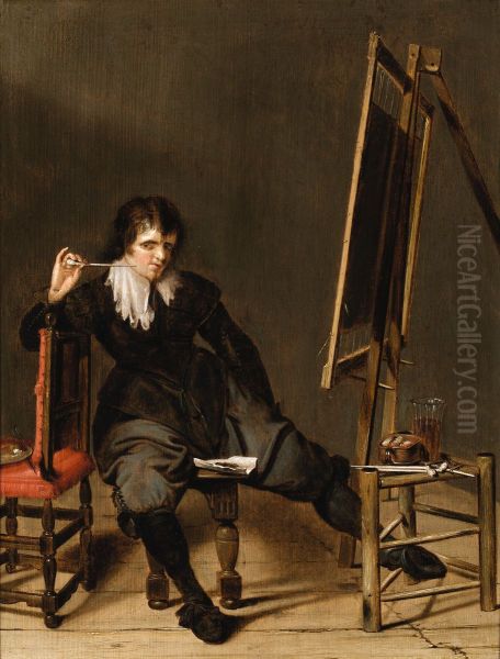An Artist in his Studio, seated on a Stool, in front of an Easel, with a Pipe Raised to His Mouth