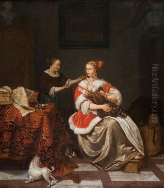 Bring the timeless beauty of Pieter Cornelisz van Slingeland's Jeune Femme Tenant Un Enfant Sur Ses Genoux Avec Sa, Suivante Dans Un Interieur into your home with a handmade oil painting reproduction. Carefully recreated on canvas by skilled artists using traditional techniques, this piece captures the delicate brushwork, subtle light, and vibrant color of the original masterpiece. With museum-level quality and rich texture, it brings elegance and artistic depth to any space. Enjoy free shipping and make this masterpiece a part of your personal collection.