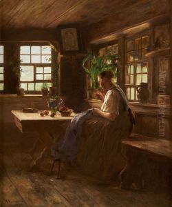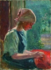 Young Girl At Her Needlework, On The Windowsill A Lace Pillow